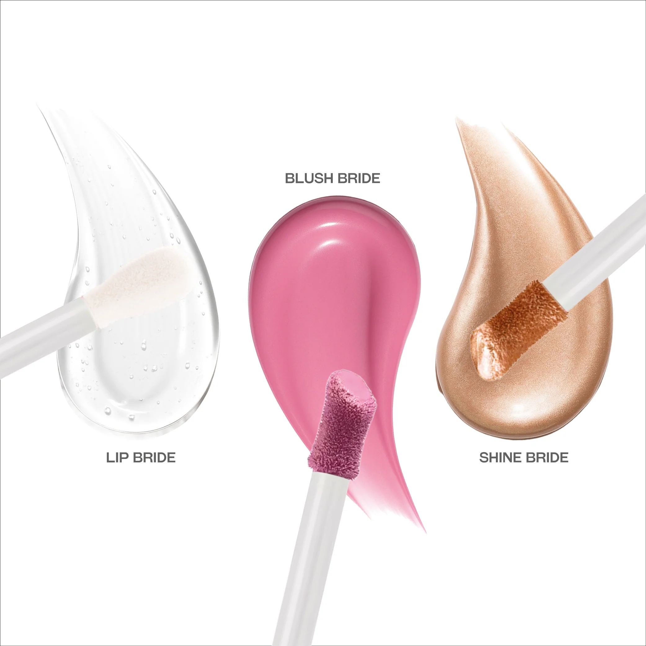 Lip Bride: Gloss labial transparente que proporciona hidratação e acabamento vinílico. Com cheiro de limão siciliano. Blush Bride: Possui Manteiga de Karite e Vitamina E. É multifuncional, com textura aveludada e acabamento matte. Shine Bride: Com Vitamina E, proporciona luminosidade e brilho à pele de forma natural e duradoura. A fórmula é leve e fácil de aplicar.